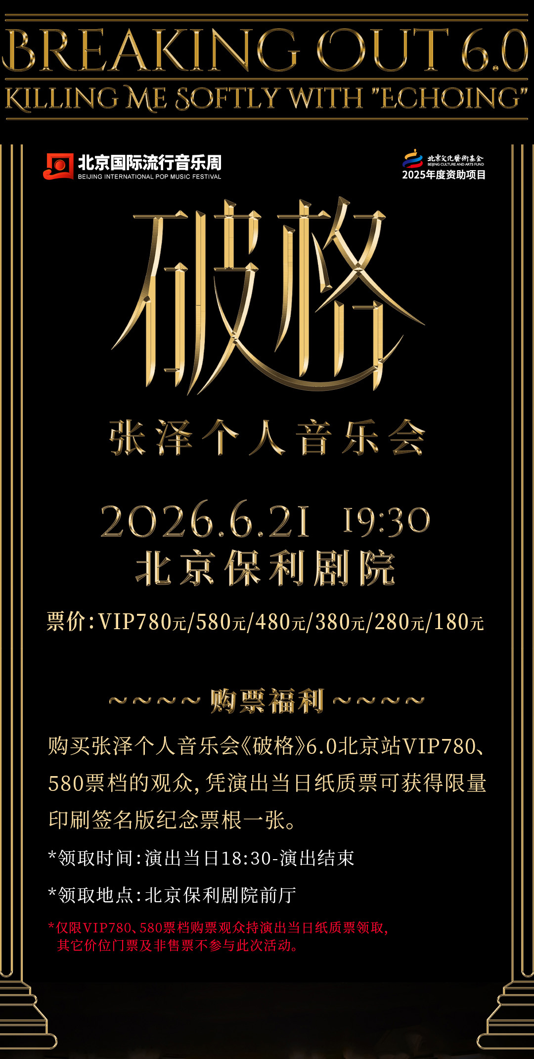 张泽个人音乐会《破格6.0》北京文化艺术基金2025年度资助项目 北京国际流行音乐周时间:2026.06.21 周日 19:30场馆:北京市 | 保利剧院 票价:180/280/380/480/580/780微信订票:18515362586电话订票:010-66552100,010-66552258